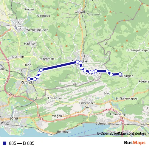 The first stop of the 885 bus route is Rüti ZH, Bahnhof and the last stop is Goldingen, Egligen. 885 (B 885) is operational during tous les jours.