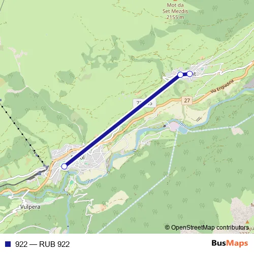 The first stop of the 922 bus route is Scuol, posta and the last stop is Sent, Plaz. 922 (RUB 922) is operational during le week-end.