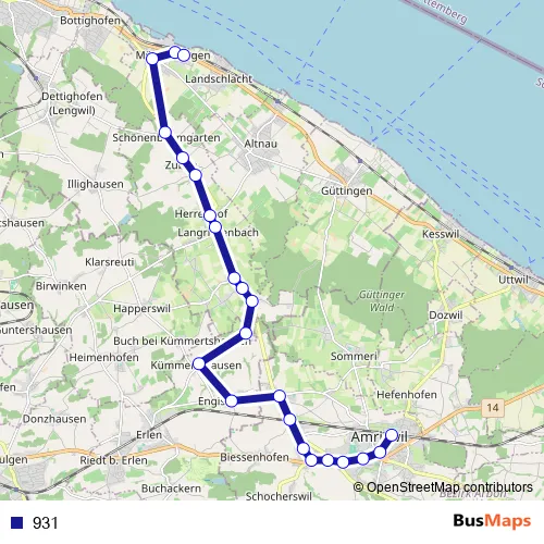 The first stop of the 931 bus route is Amriswil, Bahnhof and the last stop is Münsterlingen, Spitaleingang. 931 is operational during tous les jours.
