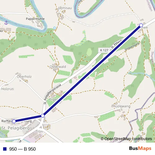 The first stop of the 950 bus route is St. Pelagiberg, Rothen and the last stop is St. Pelagiberg, Kurhaus. 950 (B 950) is operational during en semaine.