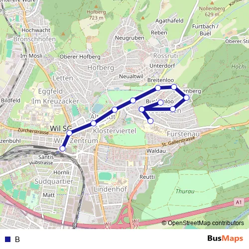 The first stop of the B bus route is Wil SG, Neulanden and the last stop is Wil SG, Bahnhof. B is operational during tous les jours.