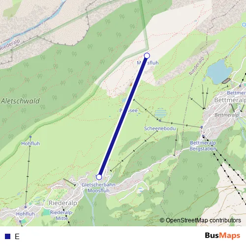 The first stop of the E cable-car route is Moosfluh and the last stop is Riederalp (Moosfluh). E is operational during tous les jours.