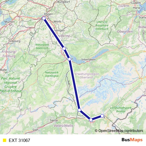 The first stop of the EXT 31067 rail route is Bern and the last stop is Brig. EXT 31067 is operational during tous les jours.