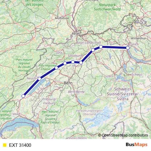 The first stop of the EXT 31400 rail route is Zürich Hb and the last stop is Yverdon-les-Bains. EXT 31400 is operational during tous les jours.