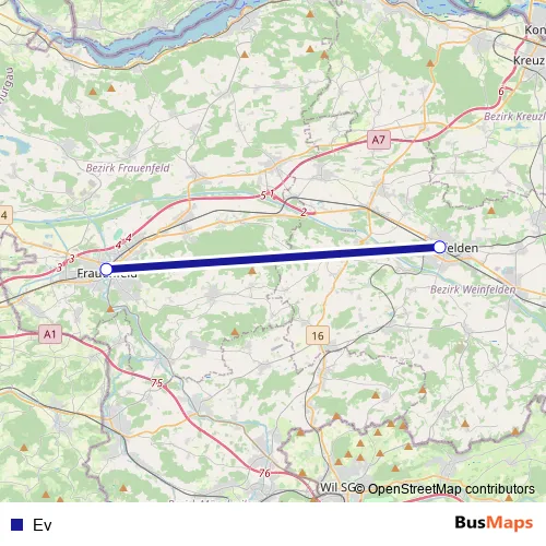 The first stop of the Ev bus route is Frauenfeld, Bahnhof and the last stop is Weinfelden, Bahnhof. Ev is operational during tous les jours.