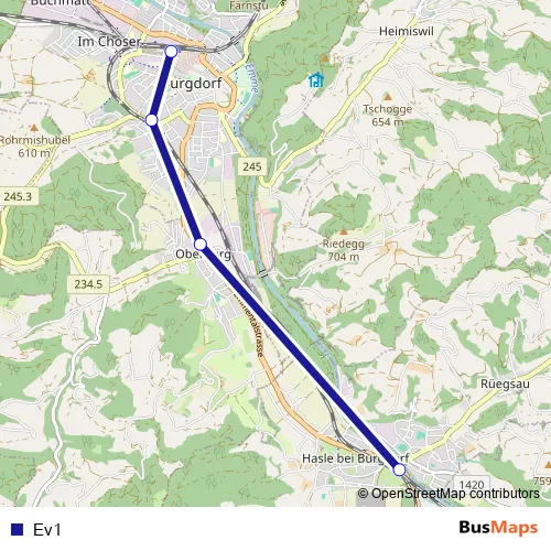 The first stop of the Ev1 bus route is Burgdorf, Bahnhof and the last stop is Hasle-Rüegsau, Bahnhof. Ev1 is operational during tous les jours.