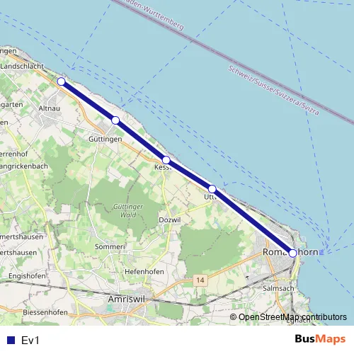 The first stop of the Ev1 bus route is Altnau, Bahnhof and the last stop is Romanshorn, Bahnhof. Ev1 is operational during tous les jours.