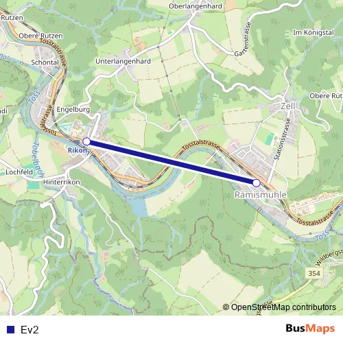 The first stop of the Ev2 bus route is Rämismühle-Zell, Bahnhof and the last stop is Rikon im Tösstal, Bahnhof. Ev2 is operational during tous les jours.