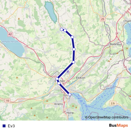 The first stop of the Ev3 bus route is Hochdorf, Bahnhof and the last stop is Luzern, Bahnhof. Ev3 is operational during tous les jours.