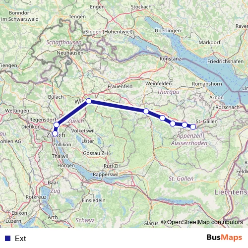 The first stop of the Ext rail route is Zürich Hb and the last stop is St. Gallen Winkeln. Ext is operational during tous les jours.