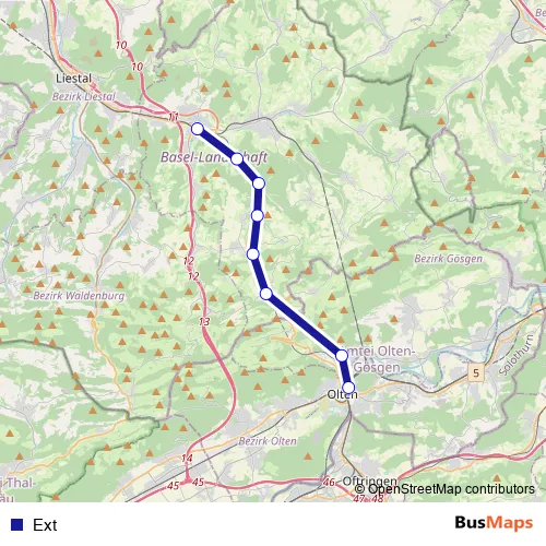 The first stop of the Ext rail route is Olten and the last stop is Sissach. Ext is operational during tous les jours.