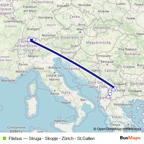 Click here to view the nearest Flixbus - Struga - Skopje - Zürich - St.Gallen bus stop.