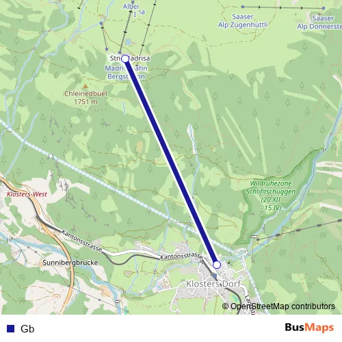 The first stop of the Gb cable-car route is Klosters Dorf (Talst. Madrisa) and the last stop is Madrisa. Gb is operational during tous les jours.