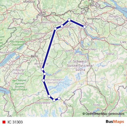 The first stop of the IC 31303 rail route is Zürich Hb and the last stop is Brig. IC 31303 is operational during tous les jours.