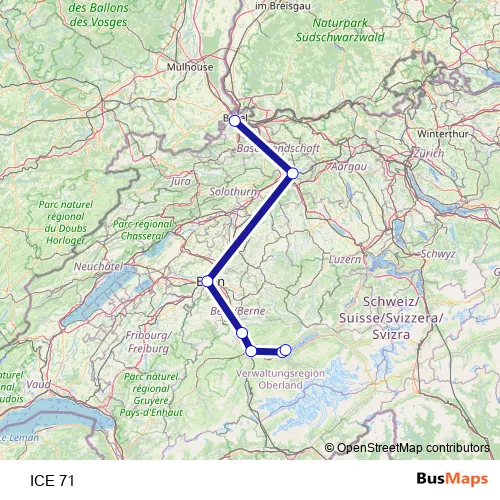 The first stop of the ICE 71 rail route is Basel Sbb and the last stop is Interlaken Ost. ICE 71 is operational during le week-end.