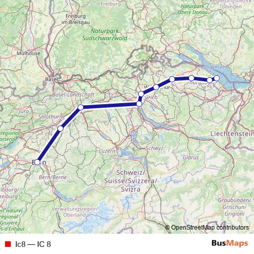 The first stop of the Ic8 rail route is Romanshorn and the last stop is Bern. Ic8 (IC 8) is operational during tous les jours.