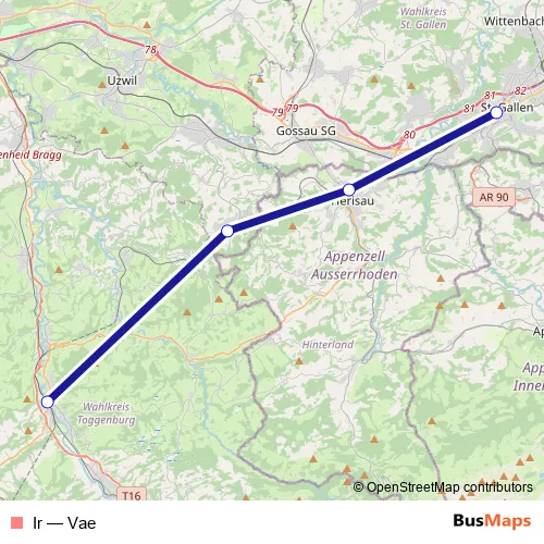 The first stop of the Ir rail route is St. Gallen and the last stop is Wattwil. Ir (Vae) is operational during tous les jours.