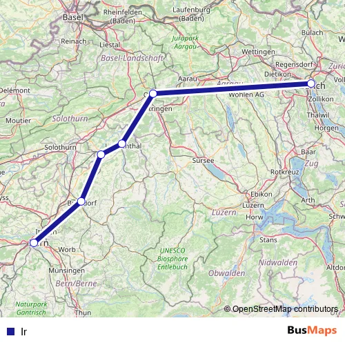 The first stop of the Ir rail route is Zürich Hb and the last stop is Bern. Ir is operational during tous les jours.