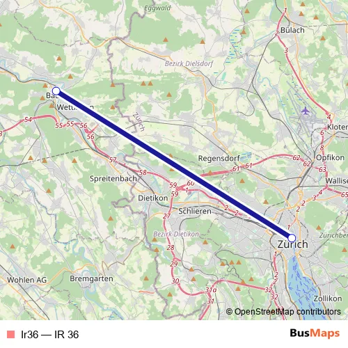 The first stop of the Ir36 rail route is Baden and the last stop is Zürich Hb. Ir36 (IR 36) is operational during tous les jours.