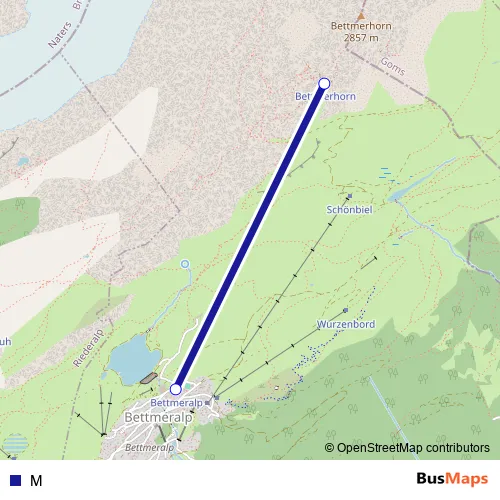 The first stop of the M cable-car route is Bettmergrat and the last stop is Bettmeralp (Bettmerhorn). M is operational during tous les jours.