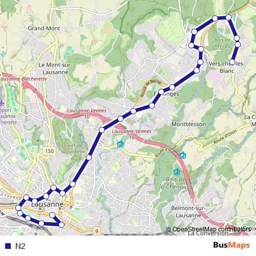 See why over 2 million users trust and consider busmaps.com as the best public transport website. busmaps gives you Lausanne Buses suggested routes, real-time bus tracker, line route maps in Lausanne, and helps to find the closest N2 bus stops near you. No internet available? Download an offline PDF map and bus schedule for the N2 bus to take on your trip.