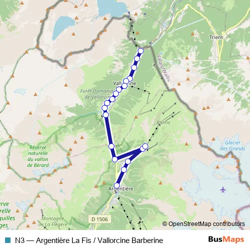 The first stop of the N3 bus route is Barberine and the last stop is Argentiere - LA Fis. N3 (Argentière La Fis / Vallorcine Barberine) is operational during tous les jours.