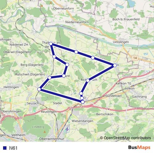 See why over 2 million users trust and consider busmaps.com as the best public transport website. busmaps gives you Frauenfeld Buses suggested routes, real-time bus tracker, line route maps in Frauenfeld, and helps to find the closest N61 bus stops near you. No internet available? Download an offline PDF map and bus schedule for the N61 bus to take on your trip.