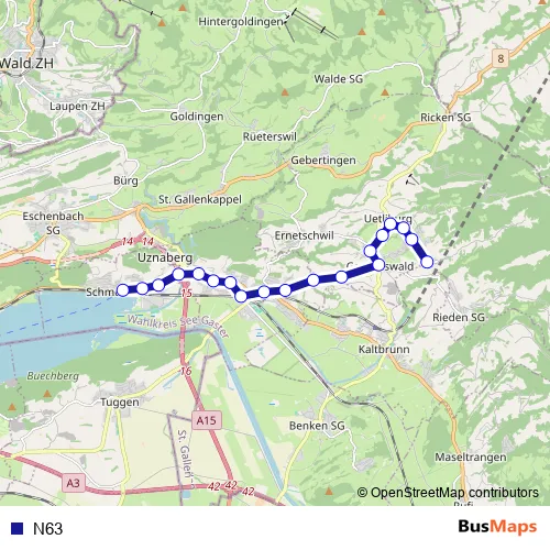 The first stop of the N63 bus route is Uetliburg SG, Giegen and the last stop is Schmerikon, Bahnhof. N63 is operational during tous les jours.