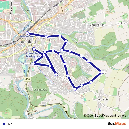 The first stop of the Nt bus route is Frauenfeld, Bahnhof and the last stop is Frauenfeld, Marktplatz. Nt is operational during tous les jours.