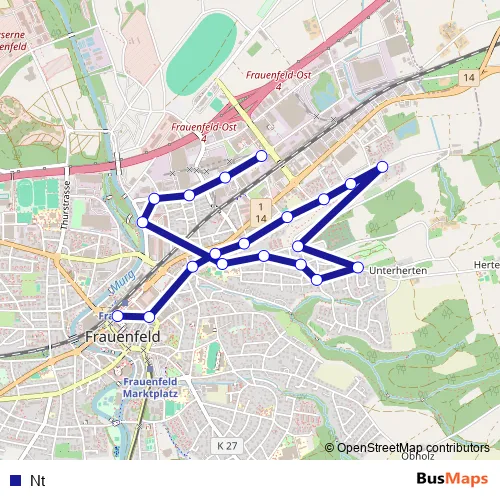 The first stop of the Nt bus route is Frauenfeld, Bahnhof and the last stop is Frauenfeld, Langfeldkreisel. Nt is operational during tous les jours.
