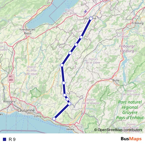 The first stop of the R 9 rail route is Puidoux and the last stop is