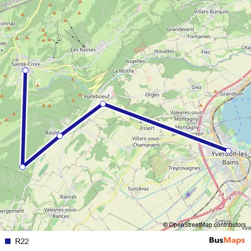 The first stop of the R22 rail route is Ste-Croix and the last stop is Yverdon-les-Bains. R22 is operational during en semaine.