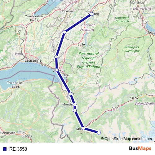 The first stop of the RE 3558 rail route is Le Châble Vs and the last stop is Fribourg/Freiburg. RE 3558 is operational during le week-end.