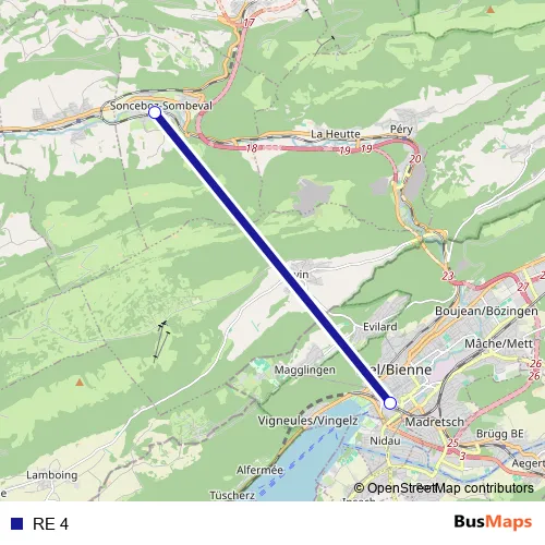 See why over 2 million users trust and consider busmaps.com as the best public transport website. busmaps gives you Biel/Bienne Rail Services suggested routes, real-time bus tracker, line route maps in Biel/Bienne, and helps to find the closest RE 4 rail stops near you. No internet available? Download an offline PDF map and bus schedule for the RE 4 rail to take on your trip.