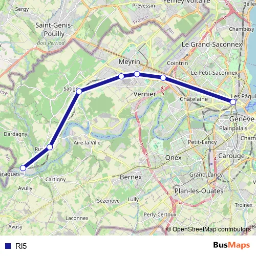 The first stop of the Rl5 rail route is La Plaine and the last stop is Genève. Rl5 is operational during tous les jours.