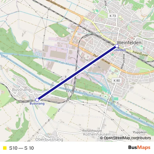 The first stop of the S10 rail route is Weinfelden and the last stop is Bussnang. S10 (S 10) is operational during tous les jours.