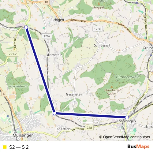 The first stop of the S2 rail route is Konolfingen and the last stop is