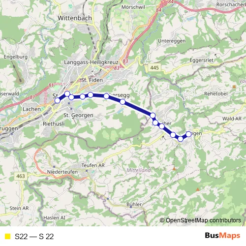 The first stop of the S22 rail route is Trogen and the last stop is St. Gallen. S22 (S 22) is operational during en semaine.