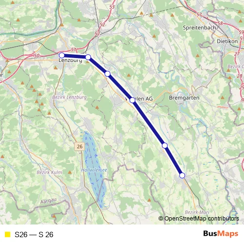 The first stop of the S26 rail route is Muri Ag and the last stop is Lenzburg. S26 (S 26) is operational during tous les jours.