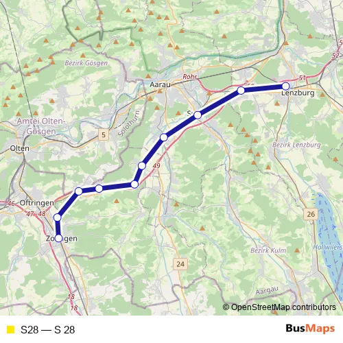 The first stop of the S28 rail route is Zofingen and the last stop is Lenzburg. S28 (S 28) is operational during tous les jours.