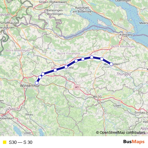The first stop of the S30 rail route is Weinfelden and the last stop is Oberwinterthur. S30 (S 30) is operational during tous les jours.