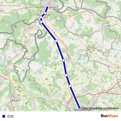 The first stop of the S33 rail route is Schaffhausen and the last stop is Winterthur. S33 is operational during tous les jours.
