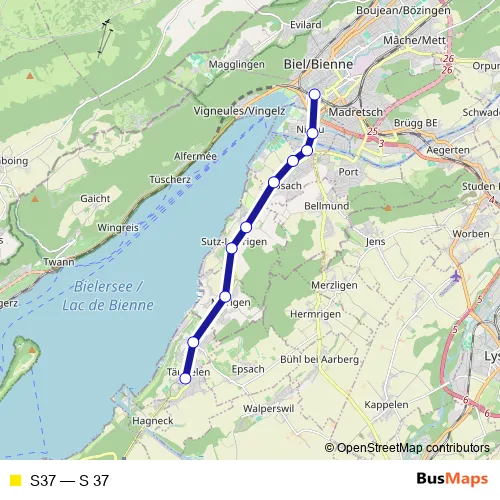 The first stop of the S37 rail route is Biel/Bienne and the last stop is Täuffelen. S37 (S 37) is operational during tous les jours.
