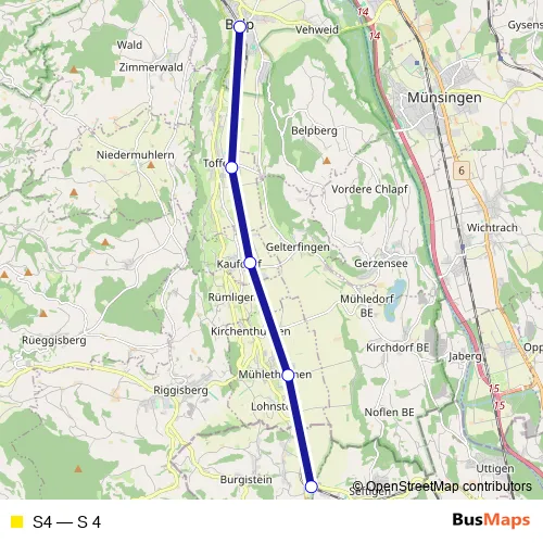The first stop of the S4 rail route is Belp and the last stop is