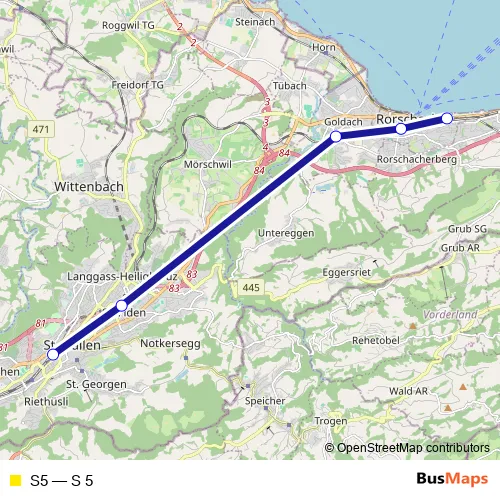 The first stop of the S5 rail route is St. Gallen and the last stop is Rorschach. S5 (S 5) is operational during tous les jours.