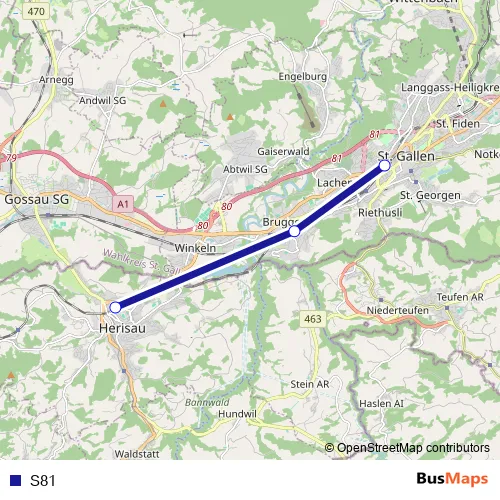 The first stop of the S81 rail route is Herisau and the last stop is St. Gallen. S81 is operational during tous les jours.