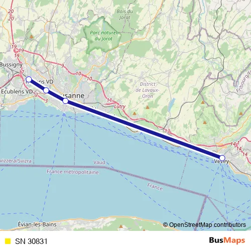 The first stop of the SN 30831 rail route is Renens Vd and the last stop is Vevey. SN 30831 is operational during tous les jours.