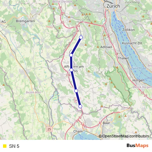 The first stop of the SN 5 rail route is Bonstetten-Wettswil and the last stop is Knonau. SN 5 is operational during le week-end.