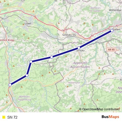 See why over 2 million users trust and consider busmaps.com as the best public transport website. busmaps gives you Sankt Gallen Rail Services suggested routes, real-time bus tracker, line route maps in Sankt Gallen, and helps to find the closest SN 72 rail stops near you. No internet available? Download an offline PDF map and bus schedule for the SN 72 rail to take on your trip.
