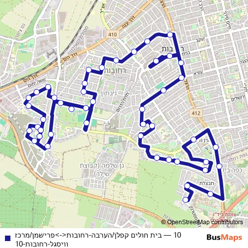 The first stop of the 10 bus route is בית חולים קפלן/הערבה and the last stop is פרישמן/מרכז וויסגל. 10 (בית חולים קפלן/הערבה-רחובות<->פרישמן/מרכז וויסגל-רחובות-10) is operational during כל יום.